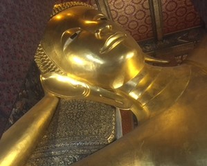 The main feature: the Reclining Buddha which is 151 feet long and 50 feet high, made of brick plaster and gold leaf. A reclining Buddha is said to represent arrival at Nirvana, defined as the state of all-knowing.
