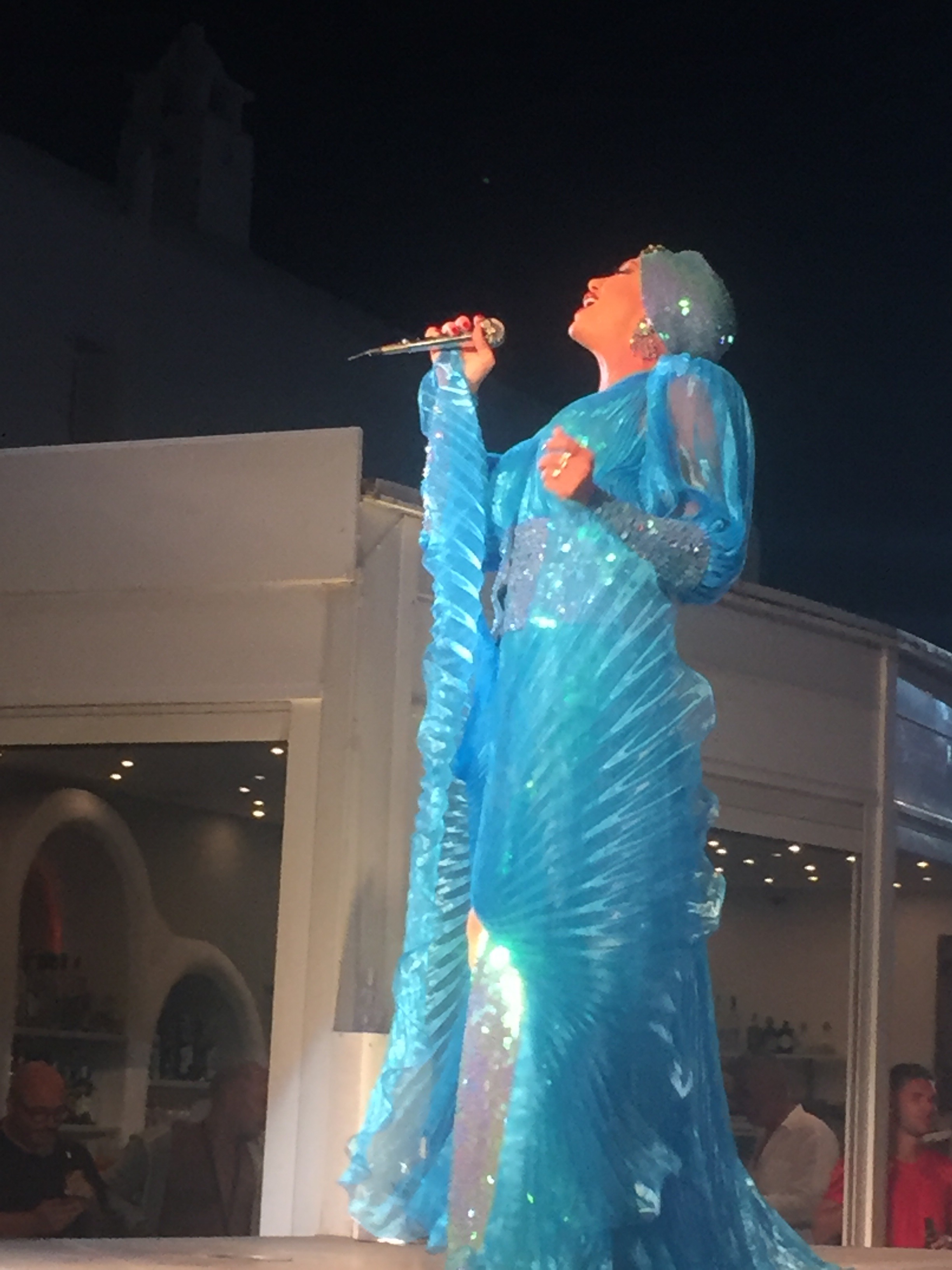 A largely gay, international and fashionable clientele in beach-to-bar looks with tanned skin, pumped biceps and gelled hair gathers around tables trading stories of how they spent their day on the Saint Tropez of the Aegean.