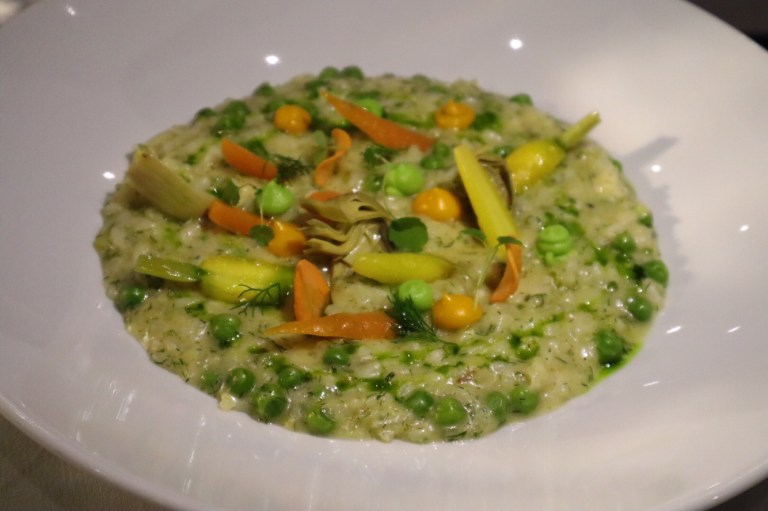 We tried the Polita Risotto. It was a lemony artichoke purée, carrot cream, pea purée, baby vegetables, dill oil and pea sprouts.