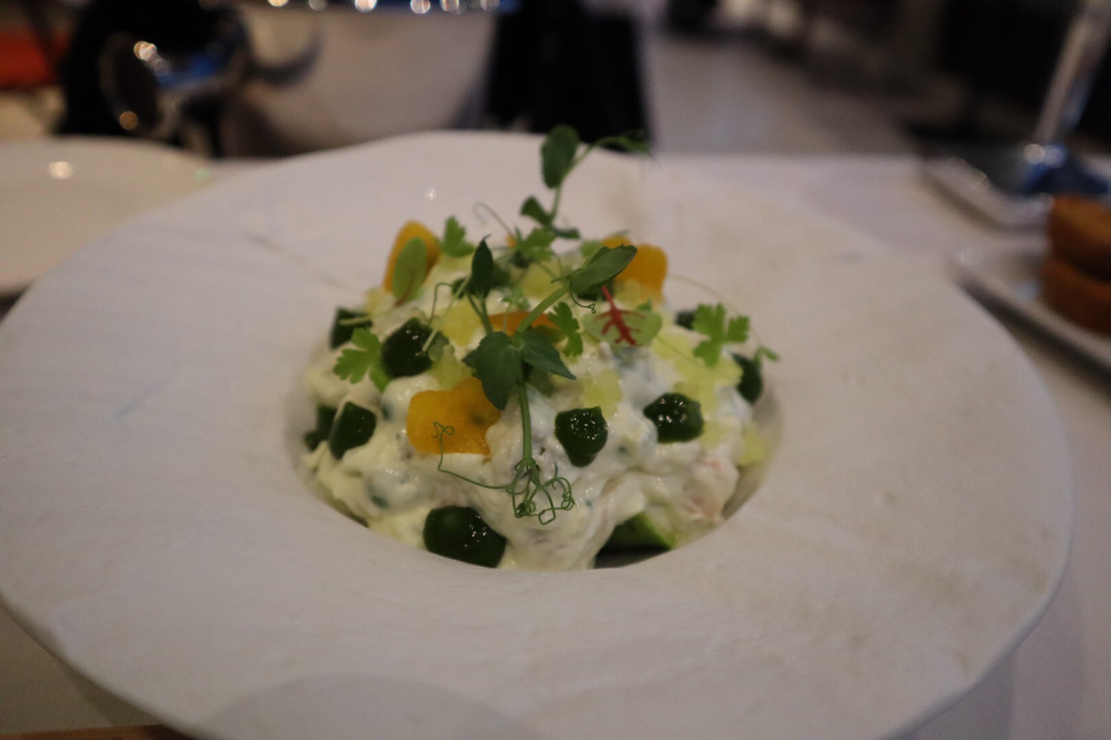 We tried the Polita Risotto. It was a lemony artichoke purée, carrot cream, pea purée, baby vegetables, dill oil and pea sprouts.