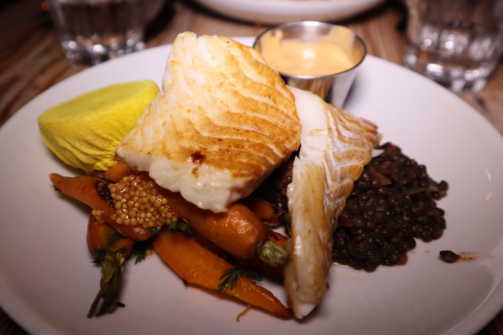 It comes with your choice of the “daily landing”, fresh local or regional fish, and three side dishes with a choice of sauce. Among my favorite choice of fish for the real deal is the cod fish as seen here with lentils, broccoli and braised carrots with a side of red curry sauce (seen here).