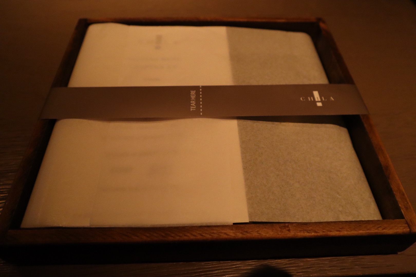 To start, the waitress presented us with a wooden box wrapped in tissue paper with a strip that said this: “Tear here.”