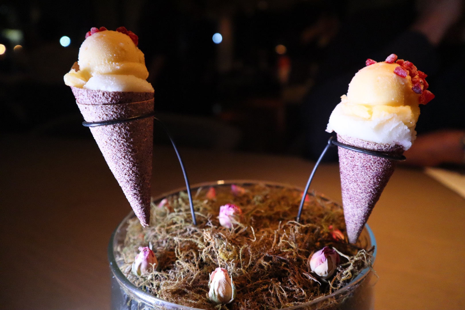 Pre-dessert came in the form of two cones, made of rice, filled with two flavors of sorbet: passion fruit and green apple with raspberry chips.