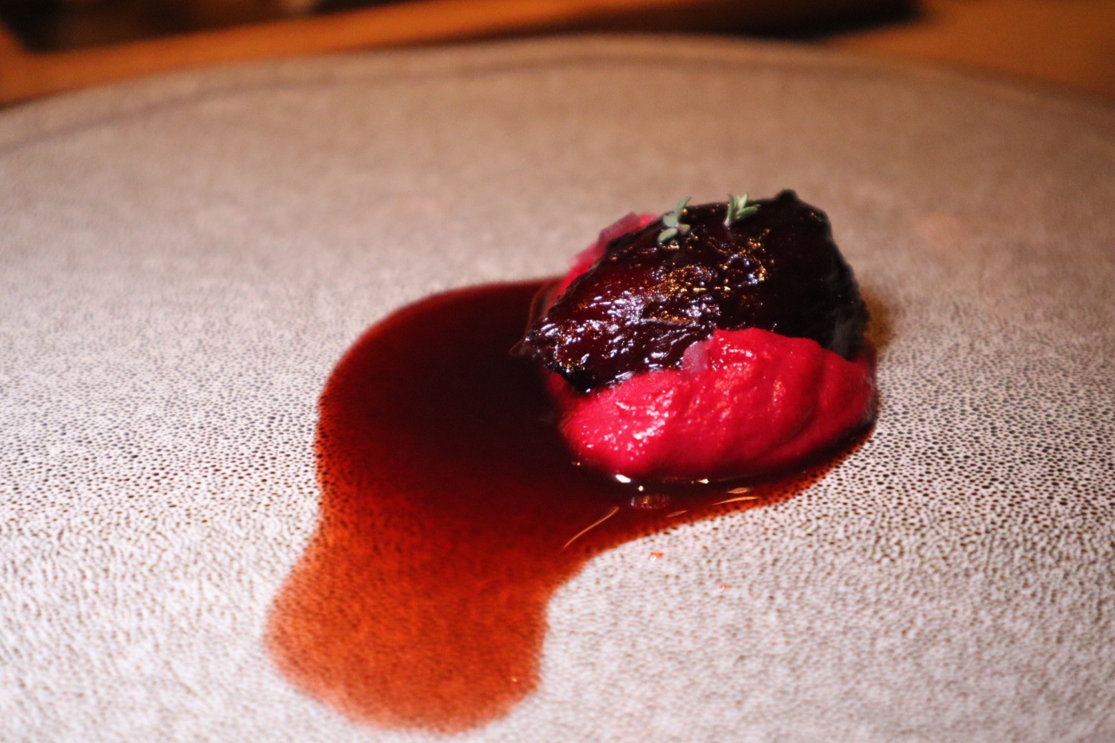Beetroot caramelized with lamb fat came served with a sauce made of grapefruit. The accompaniment: beetroot chip with guanciale, a type Italian cured meat, typically made of pork.