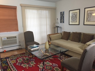 The Living Room at Casa Costera. The sliding glass door leads to a balcony. There is also a flat screen 48 inch remote controlled television. Cable and WiFi are included.Fully equipped kitchen with stainless steel fridge, dishwasher, stove, oven and microwave, a Keurig, toaster and drip coffee pot are available for your use as well as a full set of dishes, cups, glasses and utensils.Bistro table on the balcony with seating for two where you can drink your morning cup of coffee or have a glass of wine.Bedroom Sleeps two on 400-thread count cotton sheets. Comes with a remote-controlled AC unit to cool room during those steamy summer nights.